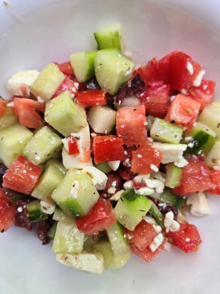 A simple summer salad with a Mediterranean flair - using cucumbers, tomatoes, feta and kalamata olives